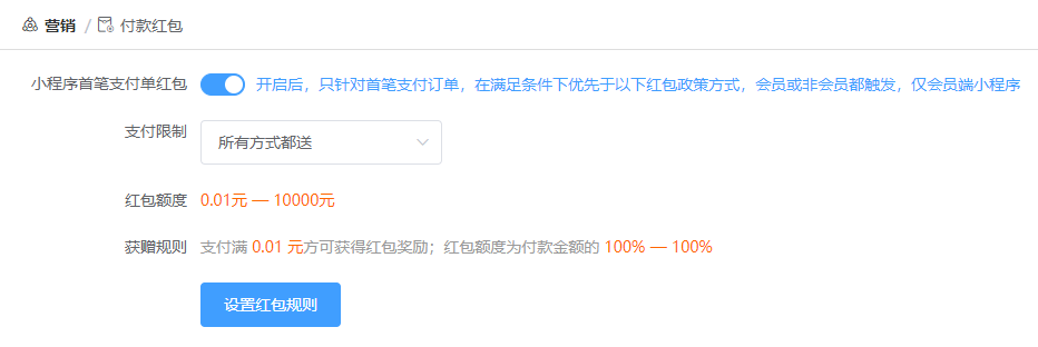 新用户首笔订单获得100%余额红包,即时返现到会员余额。